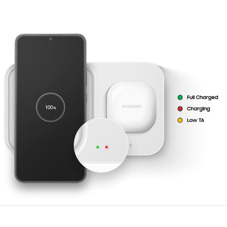 وزن شارژر بی سیم سامسونگ 170 گرم وزن بوده و ابعاد 15.6x9.1x1.64 سانتی متر می باشد و برای شارژ سریع موبایل مناسب است، این کالا دارای توان خروجی 10 تا حداکثر 15 وات بوده البته سرعت شارژ برای دستگاه های مختلف امکان دارد متفاوت باشد. در جعبه این محصول یک کابل Type-C به Type-C و یک آداپتور شارژ سریع 25 وات PD وجود دارد که برای شارژ کردن آن مناسب است. این محصول قابلیت شارژ همزمان موبایل و galaxy watch یا شارژ همزمان earbuds و galaxy watch را دارد، و لازم به ذکر است که قسمت سمت راست این کالا فقط برای شارژ سری galaxy watch و earbuds می باشد. این دستگاه همچنین برای شارژ ساعت های galaxy watch4 ,watch3,active2 , active مناسب است. از سایر ویژگی های این کالا می توان به سیستم خنک کننده و همچنین قابلیت شارژ ایمن برای جلوگیری از دمای بالا، رطوبت و گرم شدن بیش از حد در زمان شارژ اشاره کرد و همین طور قابلیت تشخیص دخالت سایر اشیا هنگام شارژ را دارا می باشد. این کالا چراغ LED دارد که وضعیت شارژ را نشان می دهد که چراغ قرمز برای شارژ است که وقتی که به صورت چشمک زن باشد مشکلی در شارژ را نمایان می کند و چراغ سبز رنگ شارژ کامل را نشان می دهد، البته توانایی خاموش کردن این چراغ ها از سری galaxy S10 به بعد وجود دارد. شدت جریان و ولتاژ ورودی آن نیز 9V/2.77A می باشد.