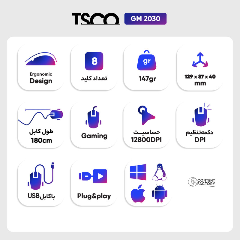 با توجه به این مشخصات، ماوس تسکو مدل GM 2030 یک گزینه عالی برای علاقمندان به بازیهای رایانهای است و میتواند تجربه بازی شما را بهبود بخشد.