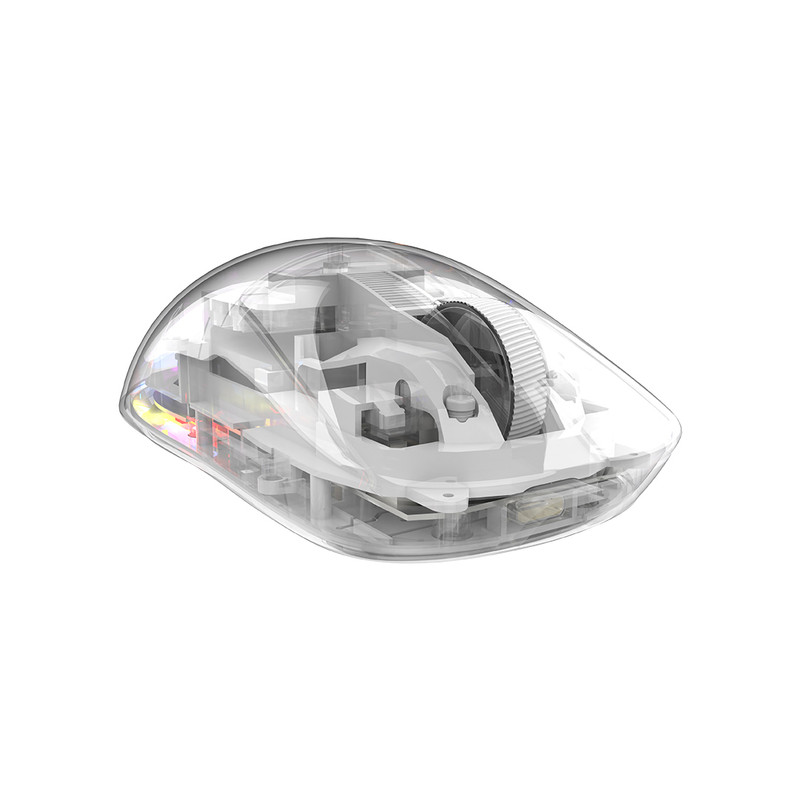 یکی از ویژگیهای چشمگیر این ماوس، طراحی شفاف و شیشهایشکل بدنه است که حس مدرن و مینیمال را القا میکند.