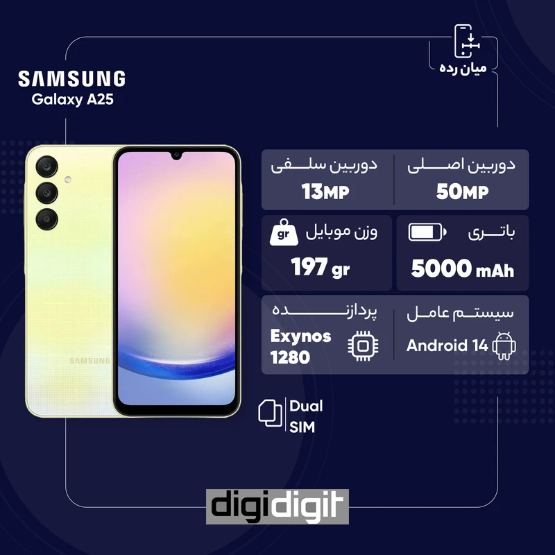 گوشی موبایل سامسونگ مدل Galaxy A25 یکی دیگر از میانردههای اقتصادی سامسونگ است که با توجه به تغییرات کوچک و بزرگ نسبت به نسل قبلی خود میتواند امسال هم انتخاب بسیاری از کاربران باشد. صفحه نمایش باکیفیت، پردازنده استاندارد و بدون لگ و دوربین مناسب نسبت به قیمت مواردی است که میتواند برای خرید این گوشی ترغیب کننده باشد.