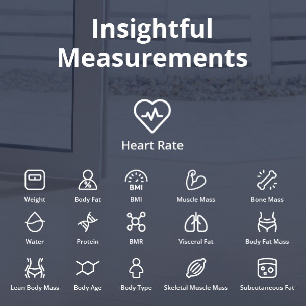 ضربان قلب، وزن، چربی بدن، BMI، توده عضلانی، Bane Mass، آب، پروتئین، BMR، چربی احشایی، توده چربی بدن، توده بدون چربی بدن، سن بدن، نوع بدن، توده عضلانی اسکلتی، چربی زیر جلدی