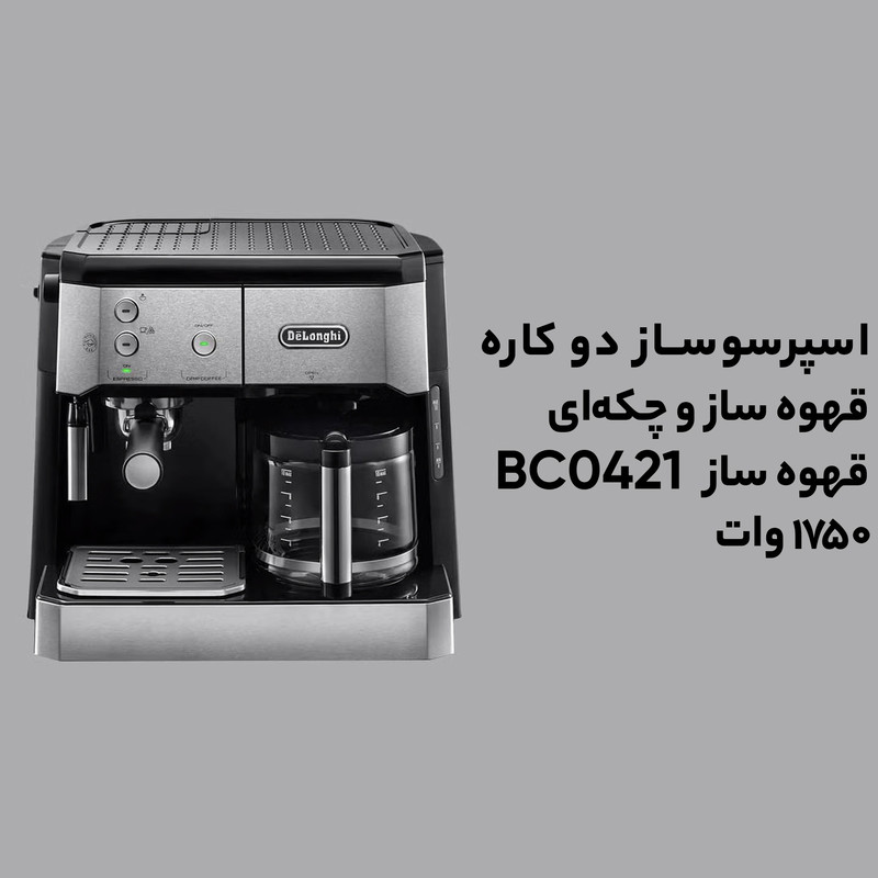 اسپرسوساز «دلونگی» (Delonghi) مدل «BCO421» دستگاهی باکیفیت است. ظاهر این دستگاه زیباست و بدنهی آن از استیل ساخته شده است. این دستگاه امکان تهیهی قهوه فرانسه، کاپوچینو و اسپرسو را دارد. برای تهیهی قهوه فرانسه یک مخزن قهوه و آب مجزا در قسمت چپ دستگاه وجود دارد. داخل مخزن قهوهی فرانسه یک فیلتر دائمی وجود دارد و بهراحتی میتوان آن را با استفاده از دستهاش خارج کرد. امکان تهیهی 10 فنجان قهوه فرانسه در این دستگاه فراهم شده است. دستگاه دارای دو نازل خروجی برای اسپرسو است و در تمپر دستگاه امکان ریختن پودر یا گذاشتن پد مخصوص وجود دارد. این دستگاه دارای صفحهی گرمنگهدار برای 10 عدد فنجان است و در قسمت زیر نازل اسپرسو، سینی چکهگیر وجود دارد؛ همچنین این دستگاه امکان تهیهی کفشیر و آبجوش نیز دارد. این دستگاه به صورت مجموع عملکرد 1750 وات توان مصرفی دارد که شامل 800 وات و 900 وات برای قسمت اسپرسو ساز و قهوه فرانسه و همچنین پرت انرژی دستگاه است. دلونگی یکی از بهترین سازندگان این دسته از محصولات است. کیفیت محصولات دلونگی همراه با خدمات پس از فروش قوی آن، تضمینشده است.