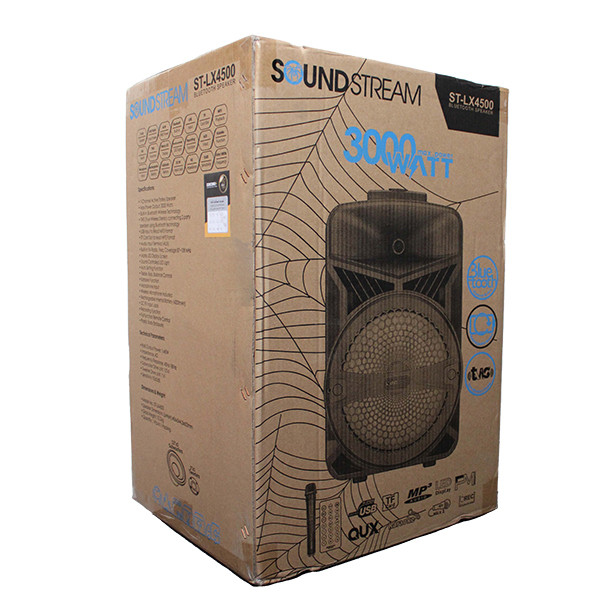 پخش کننده خانگی ساند استریم مدل ST-LX4500 از سری اسپیکر های قابل حمل برند ساند استریم می باشد که از کیفیت بالایی برخوردار بوده و مناسب دورهمی، مهمانی ها و جشن های خانوادگی می باشد. این محصول دارای امکانات و قابلیت های به روز و کاربردی است که باعث شده تا یکی از پر طرفدار ترین پخش کننده های برند ساند استریم به شمار آید. مدل ST-LX4500 دارای 1 ساب ووفر 15 وات بوده و دارای قدرت صدا 3000 وات می باشد. ورودی این دستگاه شامل AUX, BLUETOOTH, FM, MICROPHONE, SD, USB می باشد که ورودی AUX در باند خانگی امکال این را به کاربر داده است تا از طریق آن به دستگاه های دیجیتال وصل شده و به پخش موسیقی بپردازد. همچنین کاربرانی که علاقه به گوش دادن رادیو دارند می توانند از موج رادیویی FM این محصول استفاده کنند. مشخصات و ویژگی های پخش کننده خانگی ساند استریم مدل ST-LX4500 پخش کننده خانگی ساند استریم مدل ST-LX4500 از جمله سیستم های صوتی با کیفیت در بازار می باشد. این محصول با ظاهری زیبا و جذاب علاوه بر کیفیت بالا از طراحی بروز و حرفه ای برخوردار است که نظرات بیشماری را به سمت خود جلب کرده است. امروزه با پیشرفت تکنولوژی اسپیکر ها با طرح، ابعاد و کاربرد های مختلفی وارد بازار می شوند که این پخش کننده خانگی دارای ابعاد 424×366×604 میلی متر و وزن 10 کیلوگرم می باشد که به راحتی قابل حمل است و جنس آن از پلاستیک می باشد. اقلام همراه این اسپیکر مدل ST-LX4500 شامل آداپتور شارژ، کنترل، میکروفون بی سیم می باشد که کنترل آن کمک می کند تا به راحتی بتوانید از فاصله دور، تنظیمات دلخواه خود را بر روی این محصول اعمال نمایید.