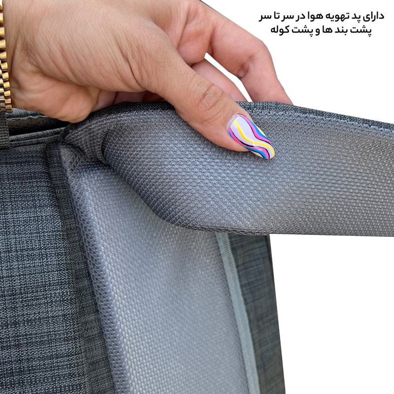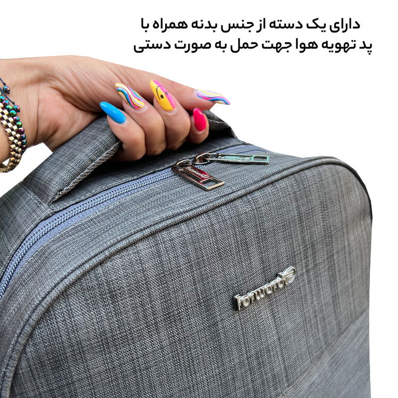 دارای یک دسته از جنس نوار الگانس جهت حمل به صورت دستی و یا آویزان کردن کوله دارای دو بند کولی همراه با پد تهویه هوا در قسمت پشتی جهت حمل به صورت کوله دارای یک دسته جهت حمل به صورت دستی همراه با پد تهویه هوا