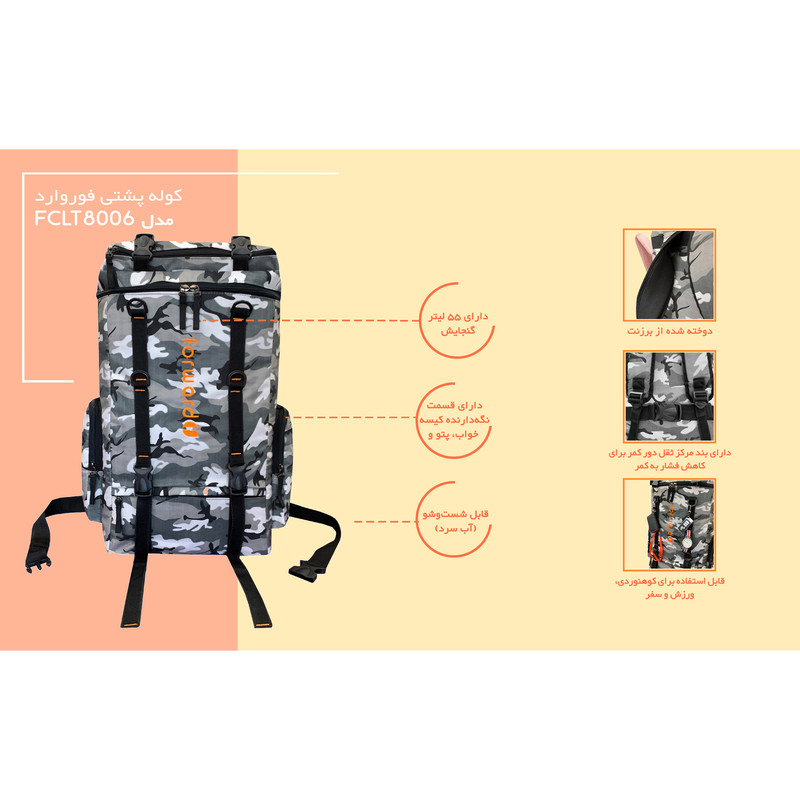 - مناسب برای کوهنوردی، ورزش و سفر - دارای یک بند مرکز ثقل دور کمر جهت کاهش فشار ناشی از وزن - دارای بند در قسمت پایین و بالای کوله جهت قرار دادن کیسه خواب و پتو و کاپشن