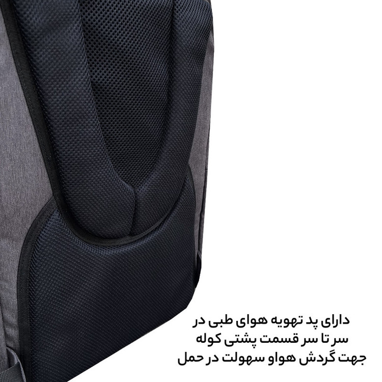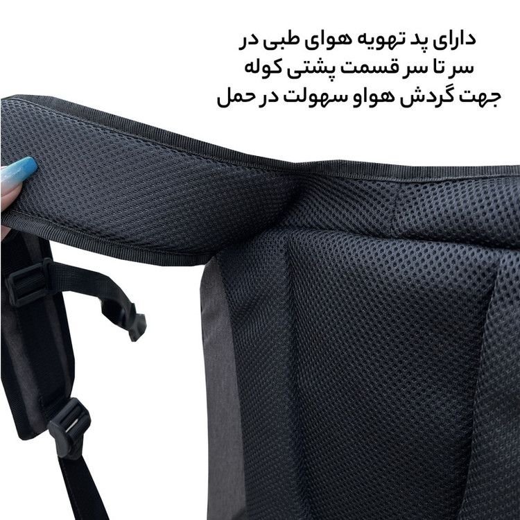 دارای دو بند کولی همراه با پد تهویه هوای سر تا سری جهت حمل کوله به صورت کولی دارای یک دسته از جنس نوار الگانس ضخیم جهت حمل به صورت دستی