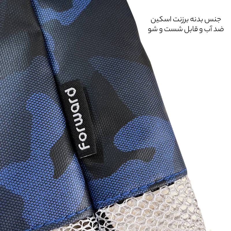 دارای جنس بدنه برزنت اسکین بسیار مقاوم ضد آب و قابل شست و شو قسمت میانی از جنس توری مشبک دو لایه جهت تهویه هوا نوار ها از جنس الگانس بسیار ضخیم و مقاوم
