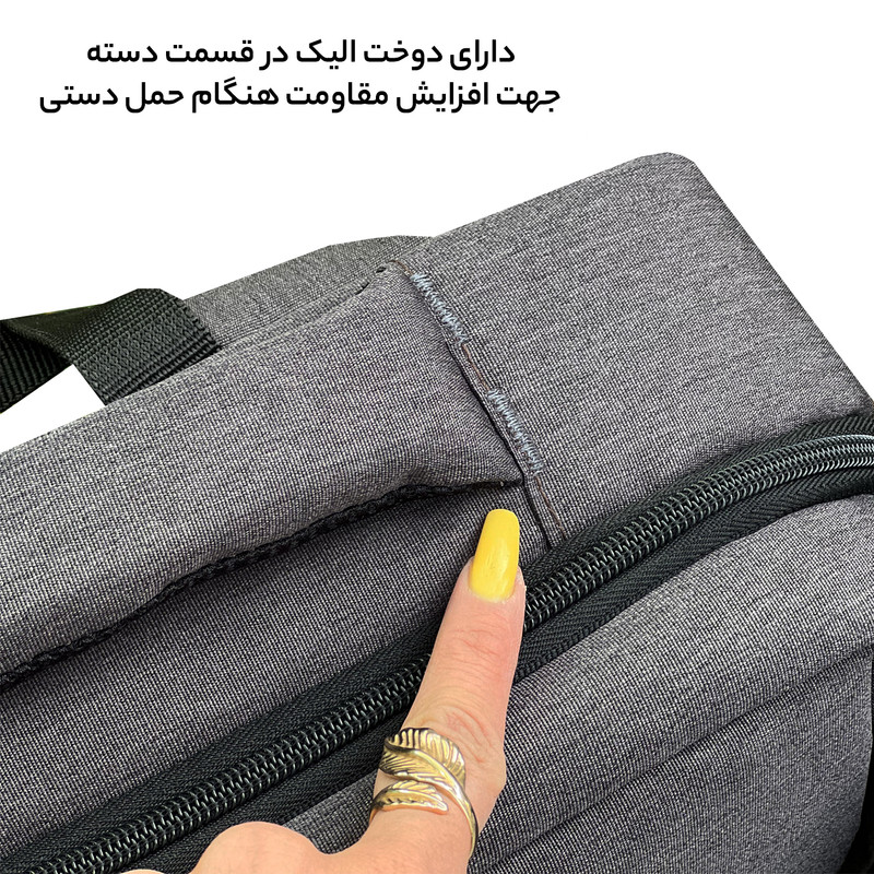 جیب بیرونی , جیب داخلی , دارای یک محفظه اصلی , محفظه نگهداری اسناد , محفظه نگهداری لپتاپ