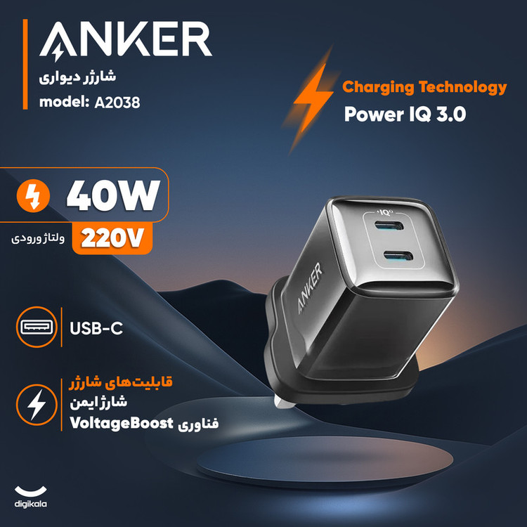 شارژر دیواری ۴۰ وات انکر مدل A2038 یک شارژر پیشرفته و مطمئن برای گوشیهای هوشمند، تبلتها و لپتاپهای کوچک است که با طراحی جمعوجور و امکانات هوشمند، تجربه شارژ سریع و ایمن را برای کاربران فراهم میکند. این شارژر با وزن ۸۵ گرم و بدنهای از جنس پلاستیک مقاوم ساخته شده و اتصال آن به برق از طریق سهپین استاندارد انجام میشود، که استفاده راحت در خانه، محل کار و سفر را ممکن میسازد. شارژر انکر A2038 دارای دو درگاه خروجی USB Type-C است و توان خروجی آن تا ۴۰ وات میرسد. شدت جریان خروجی هر پورت حداکثر ۳ آمپر است و ولتاژهای خروجی شامل ۵، ۹، ۱۲ و ۱۵ ولت میشود، که با استفاده از تکنولوژی PPS امکان تنظیم دقیق ولتاژ بین ۳.۳ تا ۱۶ ولت با جریان ۲.۵ آمپر فراهم شده است. با این امکانات، کاربران میتوانند دستگاههای مختلف از جمله گوشیهای موبایل، تبلتها و حتی لپتاپهای کوچک را با سرعت و ایمنی بالا شارژ کنند. یکی از ویژگیهای کلیدی شارژر انکر تکنولوژی شارژ سریع (Fast Charge) است که زمان شارژ دستگاهها را به حداقل میرساند. همچنین این محصول دارای سیستم حفاظتی پیشرفته سهگانه شامل Power IQ 3.0، VoltageBoost و MultiProtect است که از دستگاهها در برابر افزایش جریان، ولتاژ و حرارت محافظت میکند و خیال کاربران را از آسیب به باتری راحت میکند. حداکثر توان خروجی هر پورت ۴۰ وات است و این توان برای شارژ انواع گوشیهای سامسونگ، گوگل پیکسل، آیفون ۱۳، آیپد پرو، مکبوک ایر ۲۰۱۸ و مدلهای جدیدتر و سایر دستگاههای سازگار کافی است. شارژر دیواری A2038 بدون کابل همراه ارائه میشود و طراحی کوچک و سبک آن امکان حمل آسان را فراهم میکند. با ترکیب توان بالا، فناوری شارژ سریع، ایمنی کامل و سازگاری گسترده با دستگاهها، این شارژر انتخابی ایدهآل برای کاربران حرفهای و کسانی است که نیاز به شارژ سریع، امن و قابل اعتماد دارند.