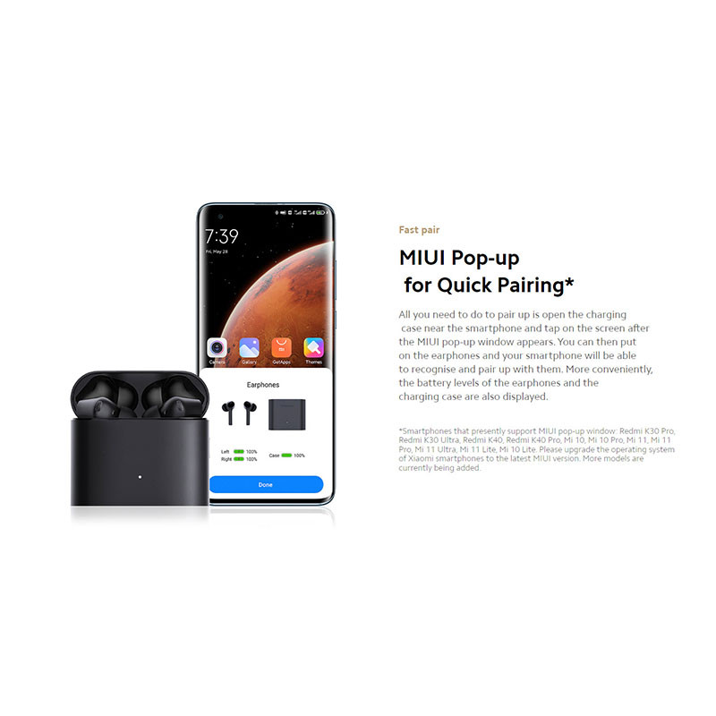 هندزفری بلوتوث شیائومی Mi Earphone 2 Pro، بهترین محصول برای شماست اگر علاقه زیادی به شنیدن موسیقی با کیفیت خارق العاده دارید. با قابلیت active noise cancellation تا 35 دسی بل، فقط صدای موزیک به گوش شما خواهد رسید. این اتفاق به کمک دو میکروفون تعبیه شده در این محصول رخ خواهد داد. یک میکروفون نویز صدای بیرون را دریافت کرده، میکروفون دوم قبل از انتقال صدا به گوش شما نویز را فیلتر میکند. این قابلیت هر صدایی حتی بسیار بلند همچون صدای فریاد را حذف میکند. به کمک Dynamic Driver سایز 12میلیمتری و دیافراگم LCP هر فرکانسی در رنج پایین و متوسط و بالا با نهایت جزییات تولید میشود. در حالت ویژه Transparency و به علت حالت ارگونومیک گوشیها میتوانید بدون درآوردن هدفون ها به راحتی صحبت کنید. چیپ Power Saving تعبیه شده در این محصول مدت زمان مکالمه با یکیار شارژ با این هندزفری را تا 6 ساعت بالا برده است. و با استفاده از باتری داخلی درون Case این محصول در مجموع بدون نیاز به اتصال به برق میتوانید تا 30 ساعت از هندزفری خود استفاده کنید. با هربار قرار دادن هندزفری به مدت 10 دقیقه درون جعبه نگهدارنده، تا 90 دقیقه میتوانید از آن استفاده کنید. case این محصول با سایر لوازم جانبی که Qi تکنولوژی را ساپورت میکنند، سازگار است. شارژ کامل Case تا یک ساعت انجام میگیرد. درگاه شارژ این محصول نیز Type-C است. اتصال این محصول مخصوصا به MIUI بسیار راحت است. برای اینکار کافیست هدفون را به گوشی نزدیک کنید و درب Case را باز کنید، بعد از خارج کردن گوشی ها از جعبه، به صورت اتوماتیک محصول را میشناسد و Pair میشود. اتصال بیسیم با بلوتوث 5.0 انجام میشود و تا فاصله 10 متری برقرار است. پشت هندزفری ها یک پوشش سرامیکی قرار دارد که به سرعت و با دقت بالایی لمس را تشخیص میدهد. با یک کلیک کوتاه میتوانید حالت دلخواه خود را انتخاب کنید، مثلا در حین پخش آهنگ مکث دهید، به تماس دریافتی پاسخ دهید، فرمان صوتی را فعال کنید و یا حالت فعلی را تغییر دهید. این محصول به شکلی طراحی شده تا برای همه افراد با سن و جنسیت و سایز متفاوت به راحتی قابل استفاده باشد. همراه محصول 4 سایز مختلف توگوشی ارائه میشود تا مناسب ترین حالت را برای خود انتخاب کنید.