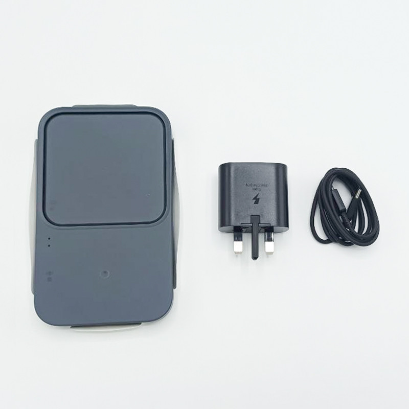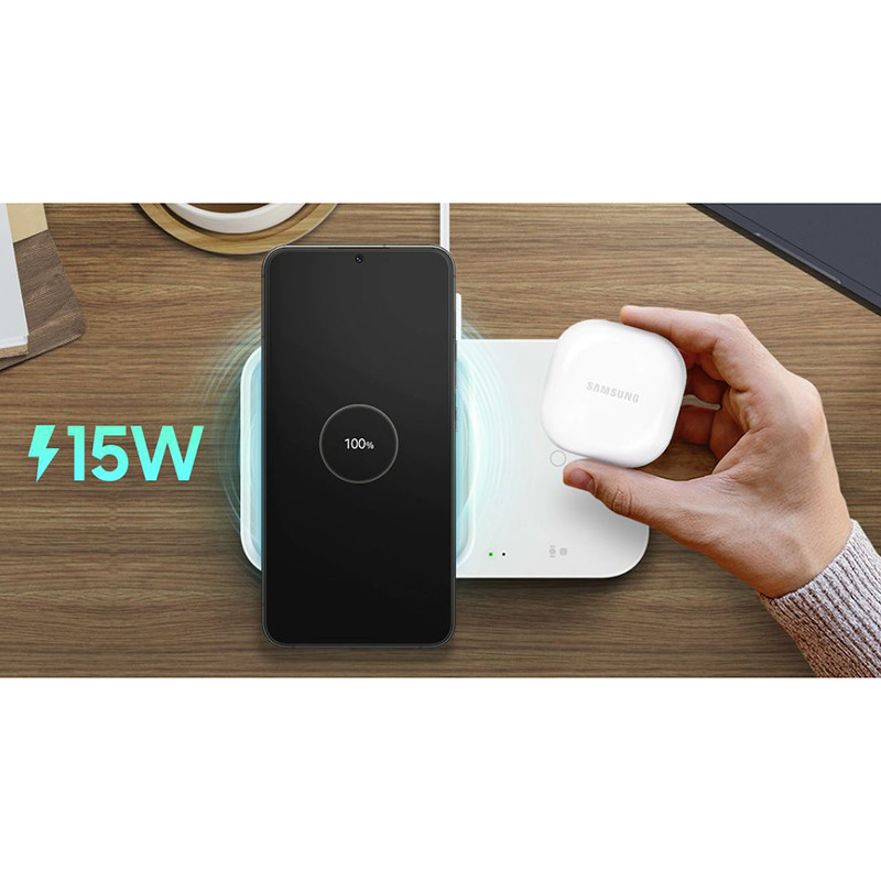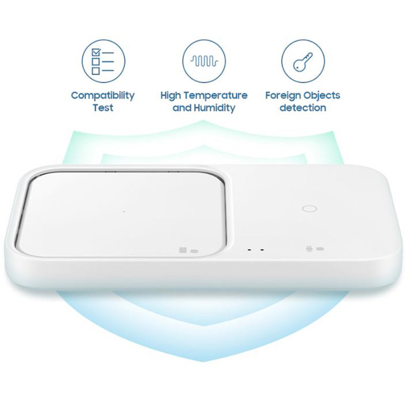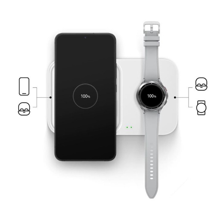 وزن شارژر بی سیم سامسونگ 170 گرم وزن بوده و ابعاد 15.6x9.1x1.64 سانتی متر می باشد و برای شارژ سریع موبایل مناسب است، این کالا دارای توان خروجی 10 تا حداکثر 15 وات بوده البته سرعت شارژ برای دستگاه های مختلف امکان دارد متفاوت باشد. در جعبه این محصول یک کابل Type-C به Type-C و یک آداپتور شارژ سریع 25 وات PD وجود دارد که برای شارژ کردن آن مناسب است. این محصول قابلیت شارژ همزمان موبایل و galaxy watch یا شارژ همزمان earbuds و galaxy watch را دارد، و لازم به ذکر است که قسمت سمت راست این کالا فقط برای شارژ سری galaxy watch و earbuds می باشد. این دستگاه همچنین برای شارژ ساعت های galaxy watch4 ,watch3,active2 , active مناسب است. از سایر ویژگی های این کالا می توان به سیستم خنک کننده و همچنین قابلیت شارژ ایمن برای جلوگیری از دمای بالا، رطوبت و گرم شدن بیش از حد در زمان شارژ اشاره کرد و همین طور قابلیت تشخیص دخالت سایر اشیا هنگام شارژ را دارا می باشد. این کالا چراغ LED دارد که وضعیت شارژ را نشان می دهد که چراغ قرمز برای شارژ است که وقتی که به صورت چشمک زن باشد مشکلی در شارژ را نمایان می کند و چراغ سبز رنگ شارژ کامل را نشان می دهد، البته توانایی خاموش کردن این چراغ ها از سری galaxy S10 به بعد وجود دارد. شدت جریان و ولتاژ ورودی آن نیز 9V/2.77A می باشد.